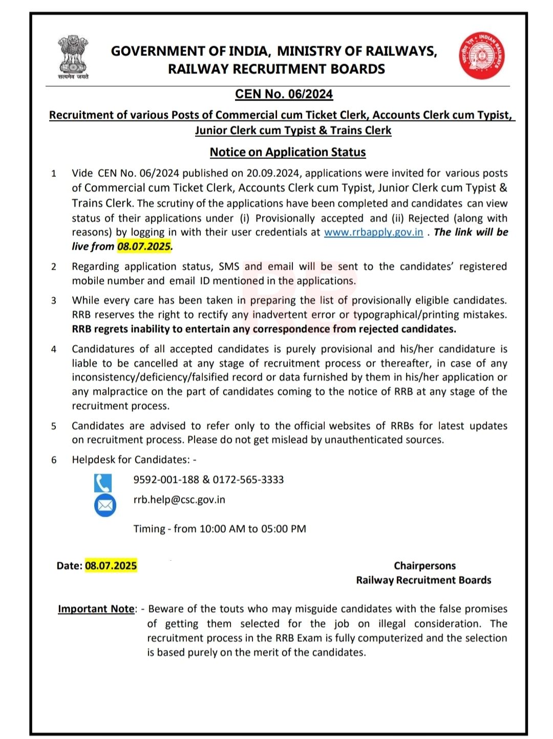 - Age Relaxation as per Railway Recruitment Board (RRB) Recruitment Rules.